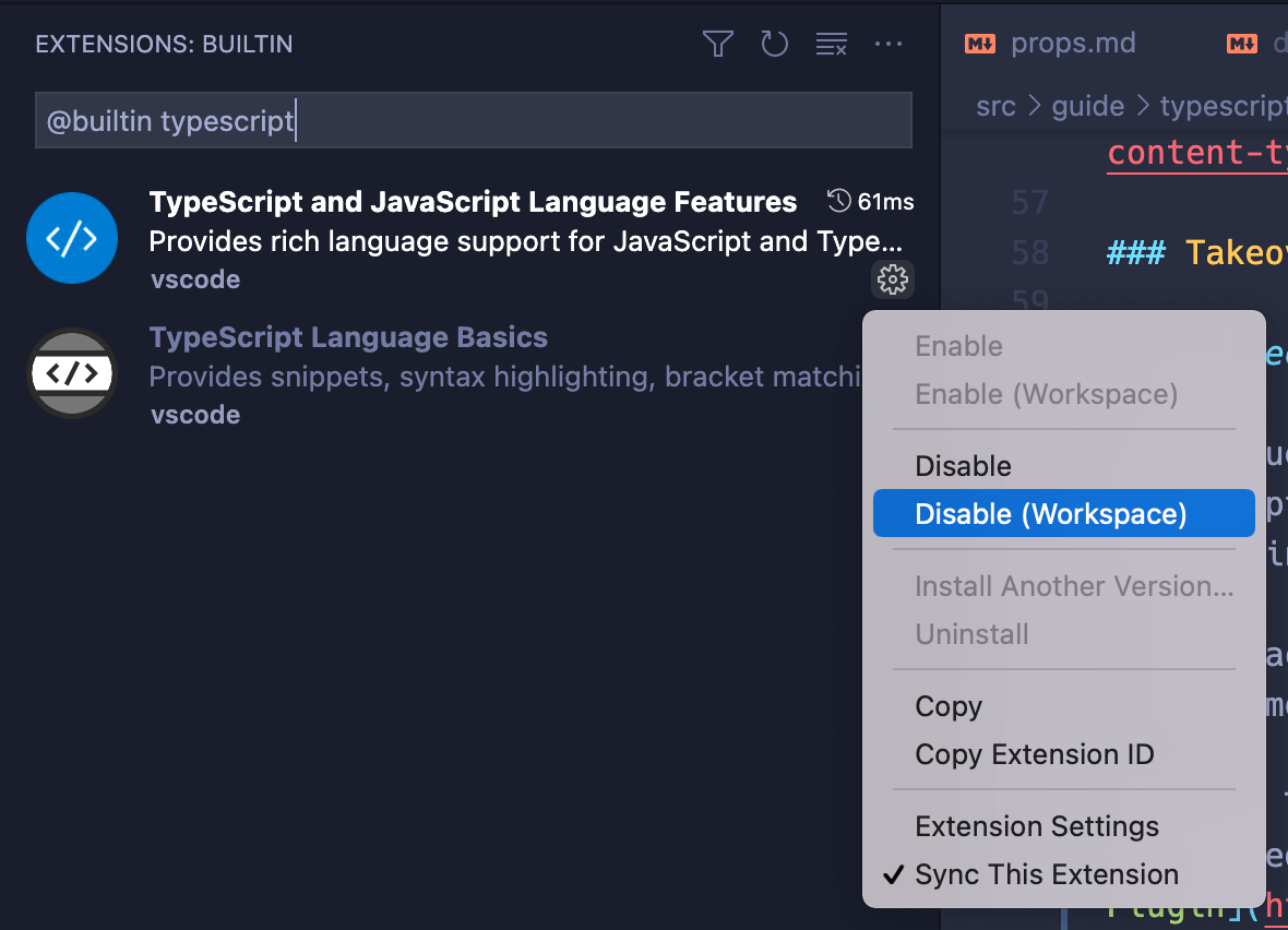 ). - Clique no pequeno ícone de engrenagem da "TypeScript and JavaScript Language Features" ou "Funcionalidades da Linguagem JavaScript e TypeScript" (Português), e selecione "Disable (Workspace)" ou "Desativar (Espaço de Trabalho)" (Português).